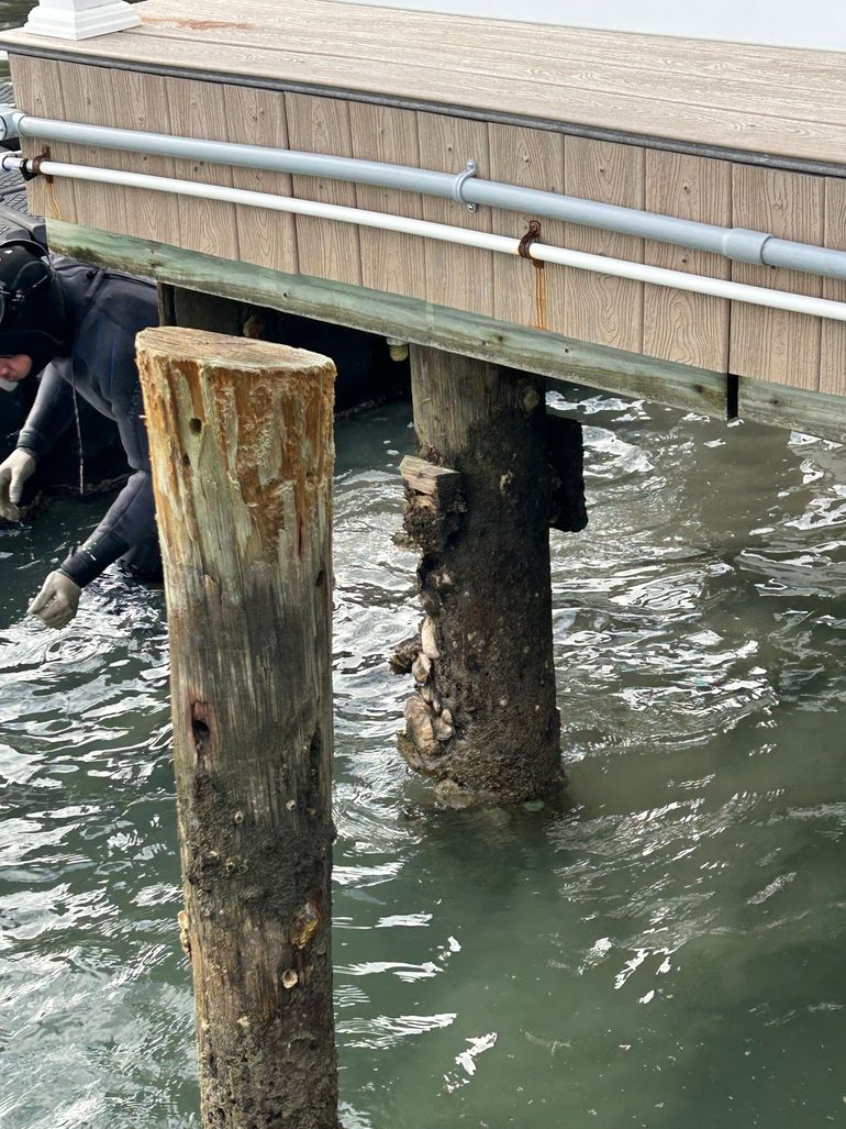 *Re-wrapping - Our divers cut and hand remove all of the old wrap, which we then dispose of. *Cleaning - Our divers hand scrape the pilings, top to bottom until the piling is bare, then give a final inspection.